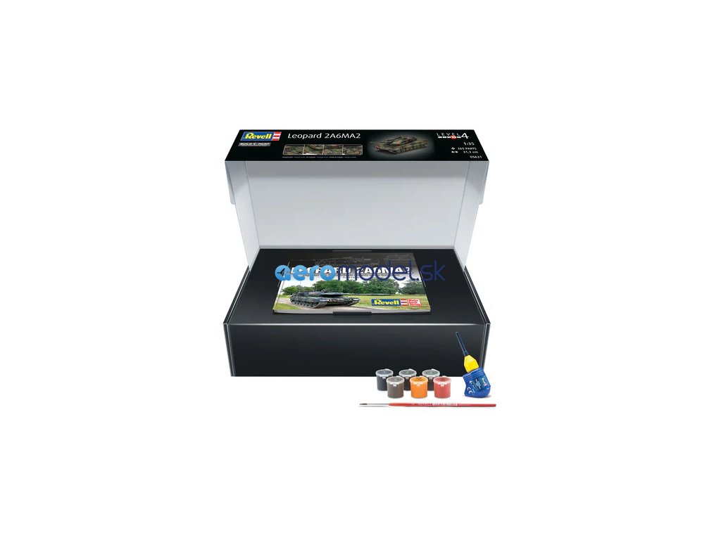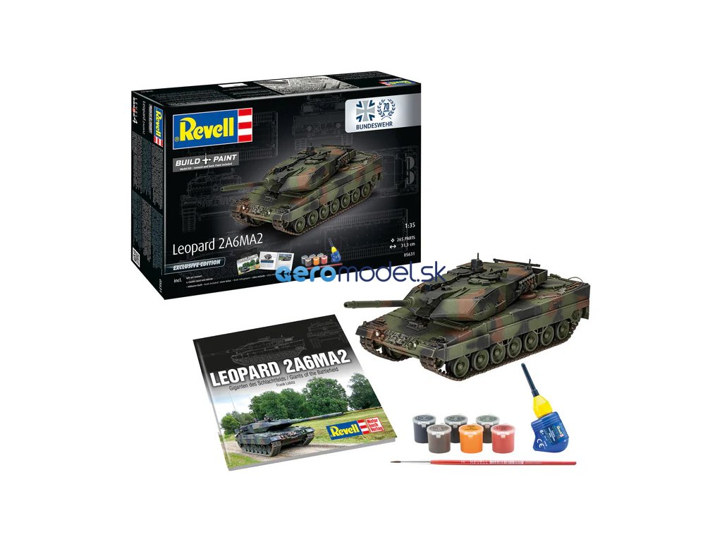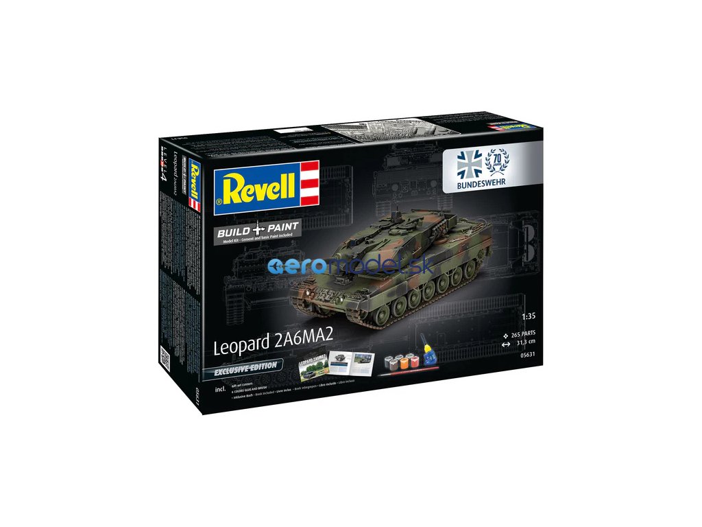 Plastikový model Revell 05631 - tank Leopard 2 A6A2 70 Years Bundeswehr v měřítku 1:35 ke slepení. Stavebnice obsahuje 265 dílků, obtížnost 4.