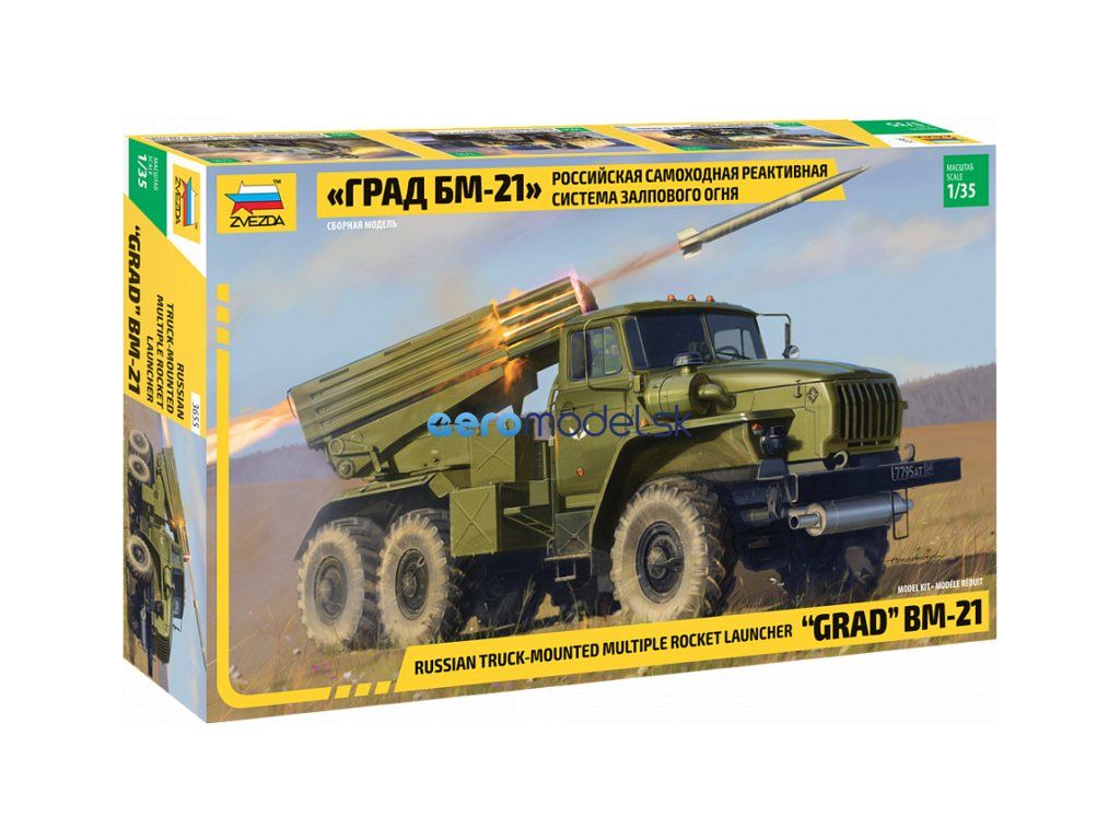 Plastikový model Zvezda 3655 - ruský samohybný raketový systém "Grad" BM-21 v mierke 1:35 na zlepenie. Stavebnica obsahuje 429 dielikov, dĺžka 216 mm.