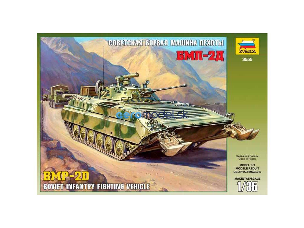 Plastikový model Zvezda 3555 - bojové vozidlo pechoty BMP-2D (vojna v Afganistane) v mierke 1:35 na zlepenie. Stavebnica obsahuje 373 dielov, dĺžka 240 mm.