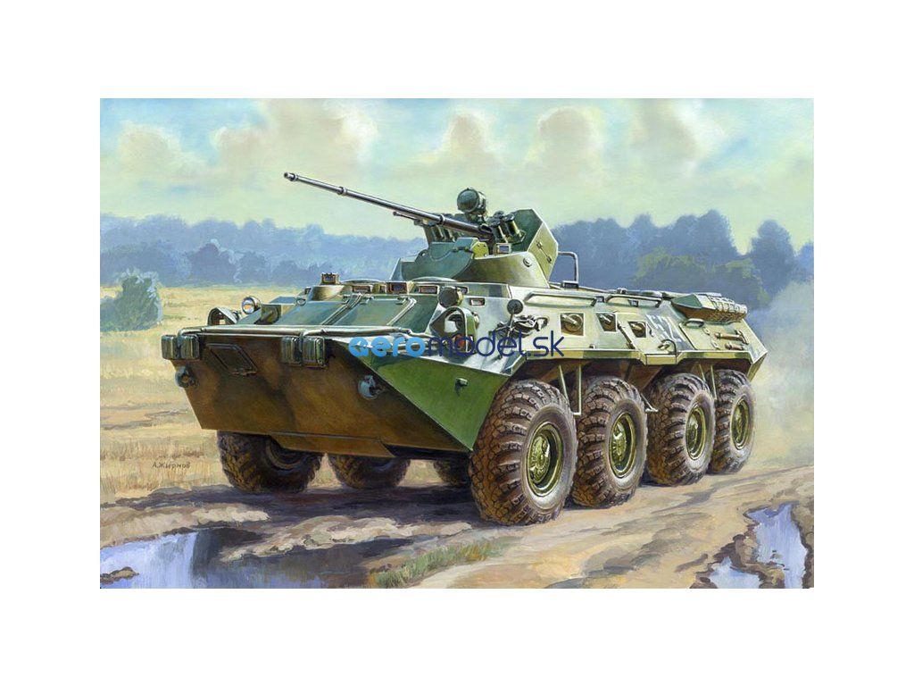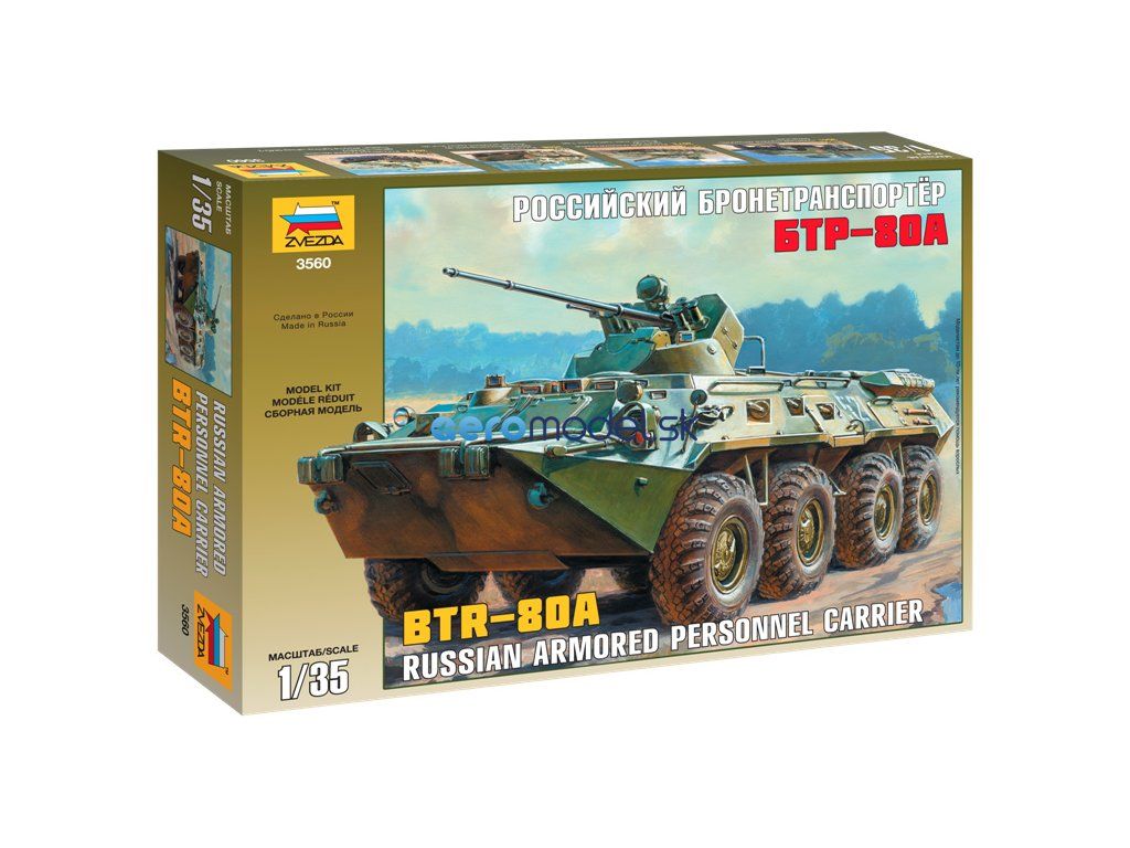 Plastikový model Zvezda 3560 - ruský obrnený transportér BTR-80A v mierke 1:35 na zlepenie. Stavebnica obsahuje 231 dielikov, dĺžka 210 mm.