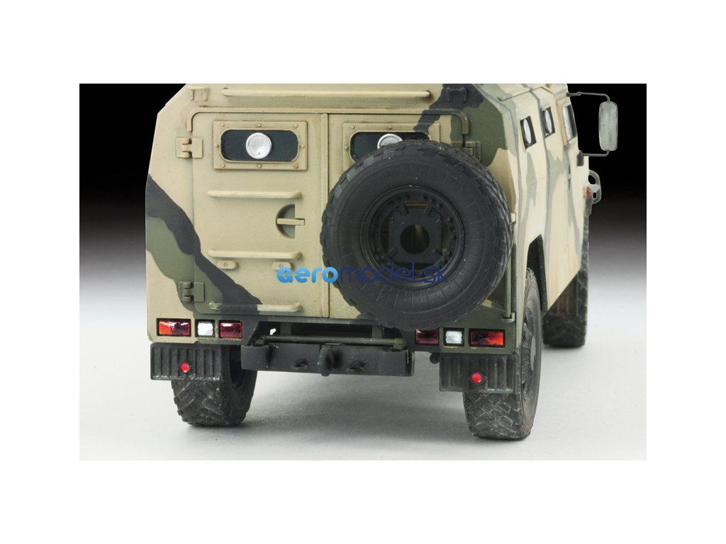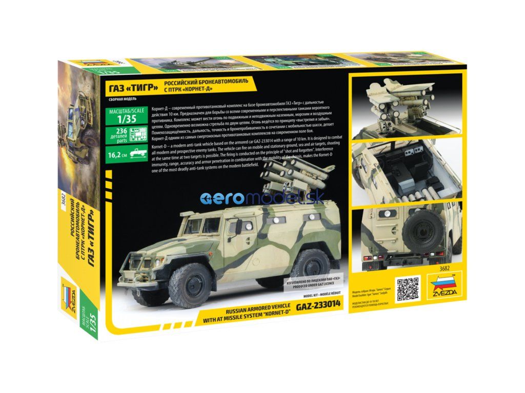 Plastikový model Zvezda 3682 - ruské špeciálne obrnené vozidlo GAZ 233014 s protitankovým systémom Kornet D v mierke 1:35 na zlepenie. Sada obsahuje 236 dielikov, dĺžka 162 mm, obtiažnosť 3.