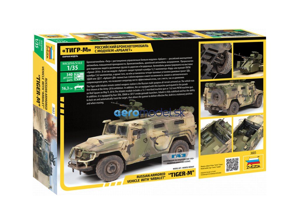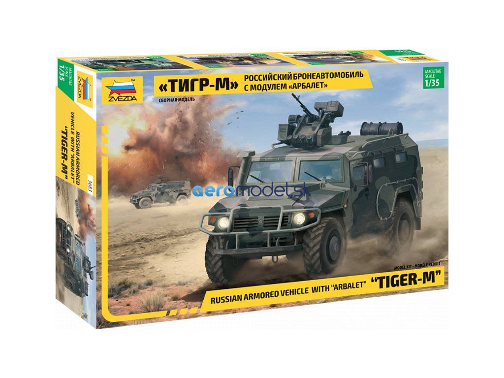 Plastikový model Zvezda 3683 - vojenský GAZ Tiger w/Arbalet v mierke 1:35 na zlepenie. Stavebnica obsahuje 340 dielikov, dĺžka 163 mm.