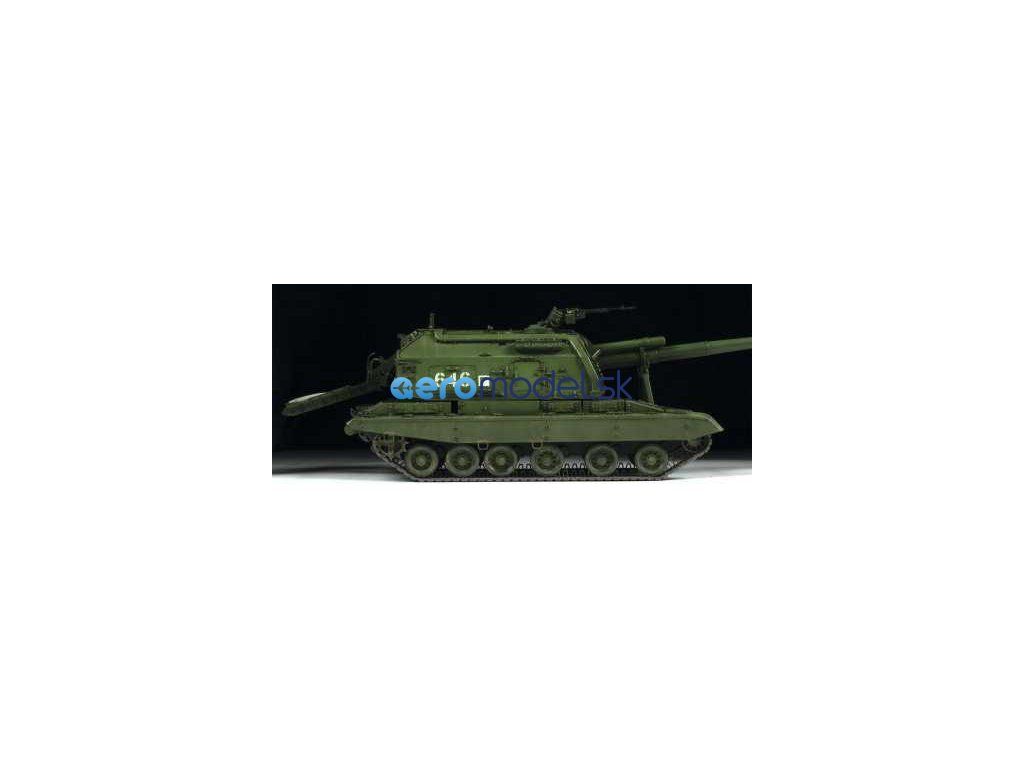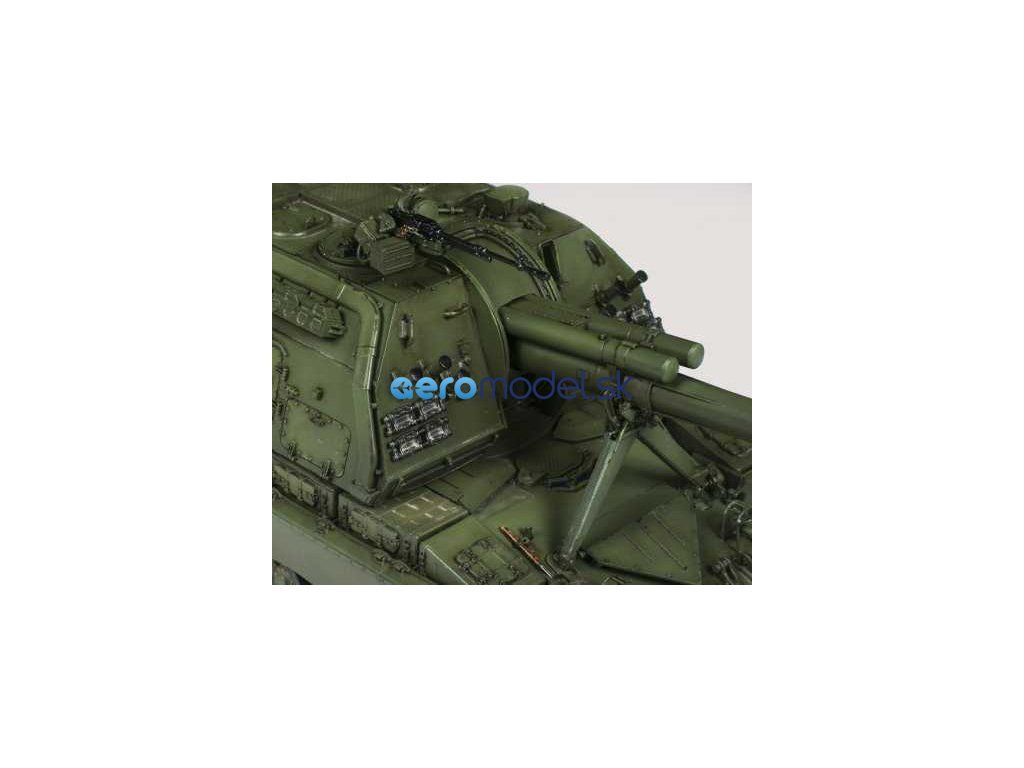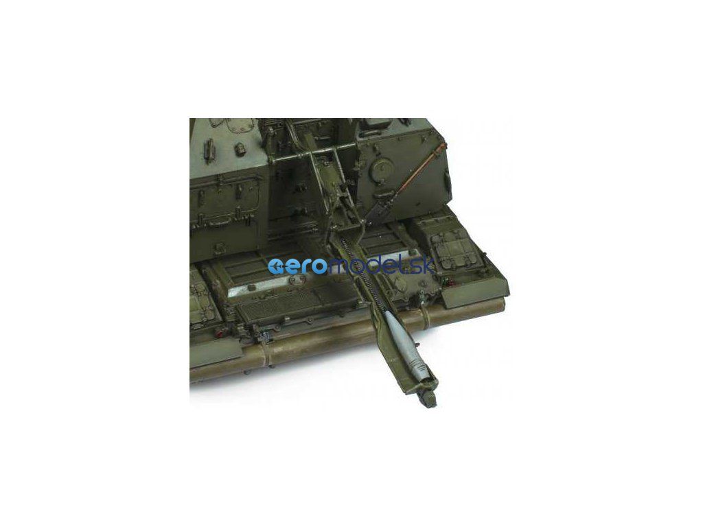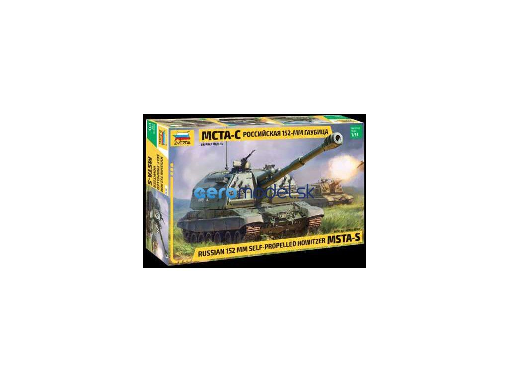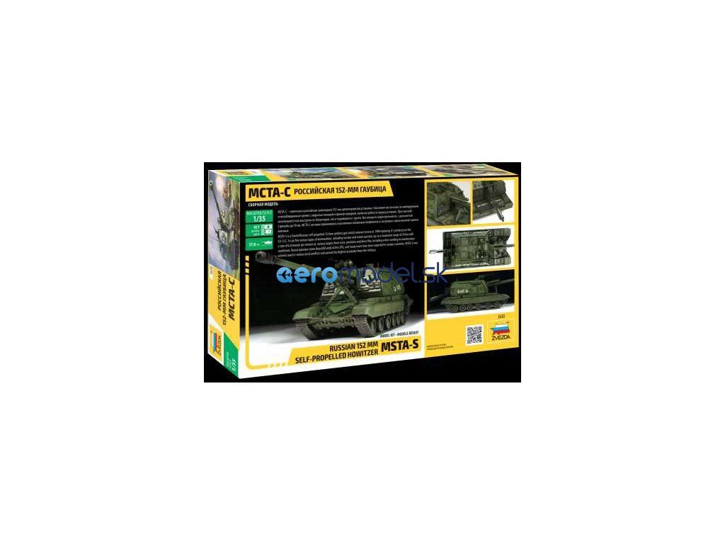 Plastikový model Zvezda 3630 - ruský samohybný delostrelecký podvozok 152 mm Msta-S v mierke 1:35 na zlepenie. Stavebnica obsahuje 451 dielov, dĺžka 378 mm.
