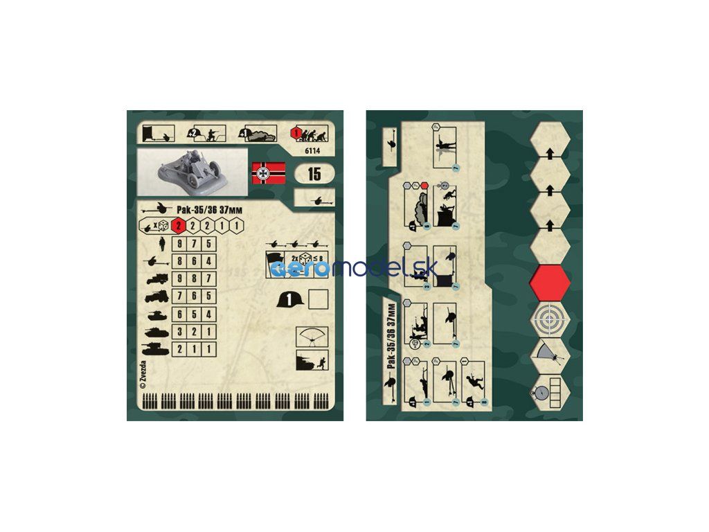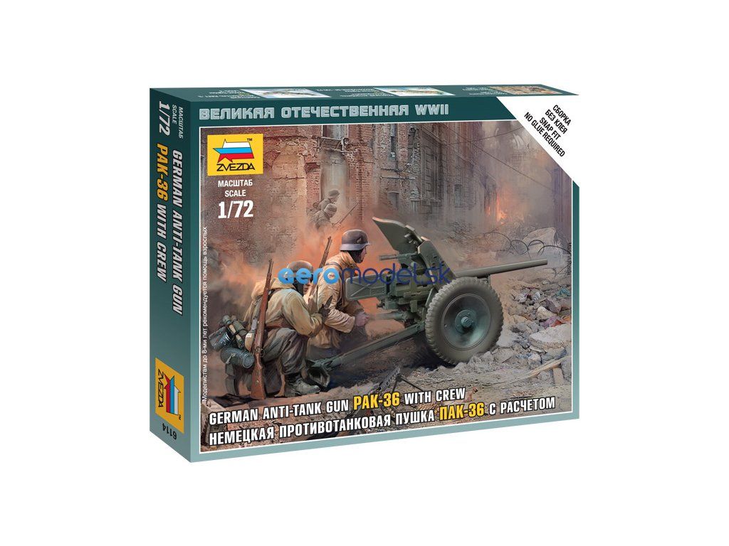Plastikový model Zvezda 6114 - nemecká protitanková zbraň Pak-36 s posádkou v mierke 1:72. Sada obsahuje 13 dielikov, dĺžka 47 mm, obtiažnosť 2.