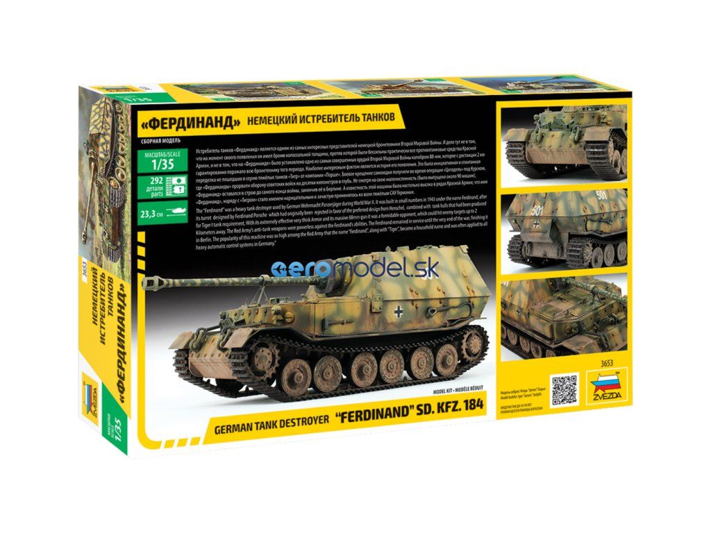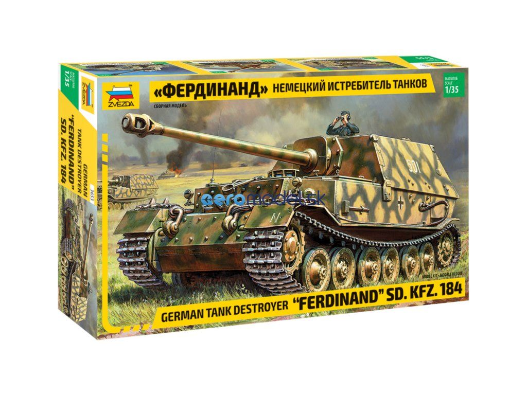 Plastikový model Zvezda 3653 - nemecký stíhač tankov "Ferdinand" v mierke 1:35 na zlepenie. Stavebnica obsahuje 292 dielikov, dĺžka 230 mm, obtiažnosť 3.