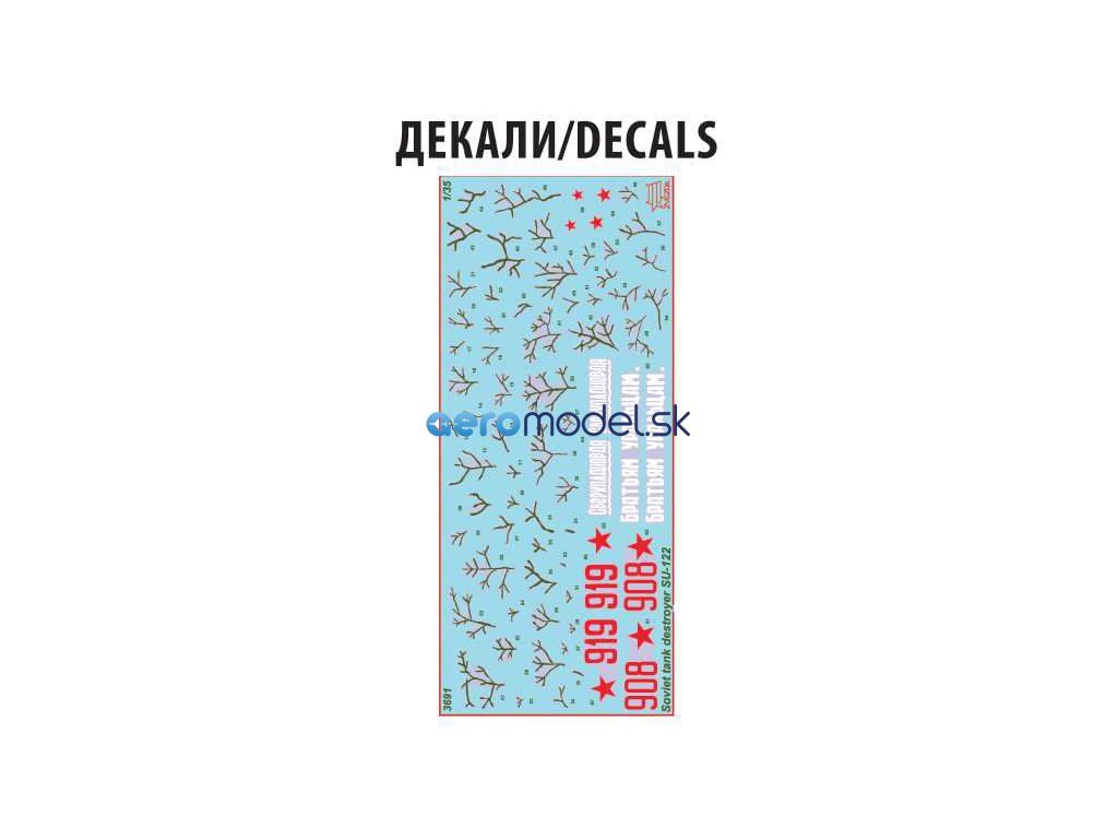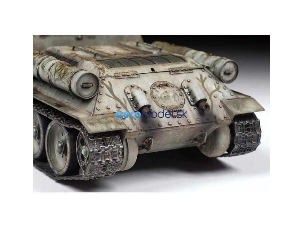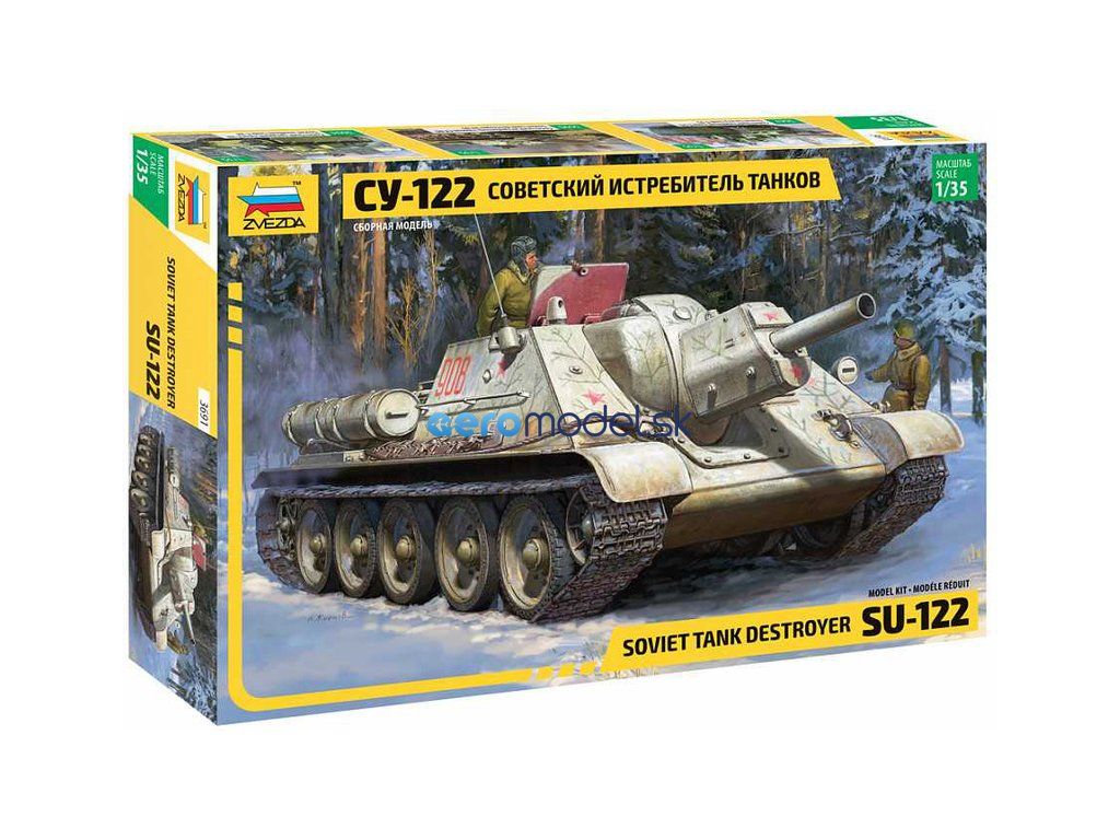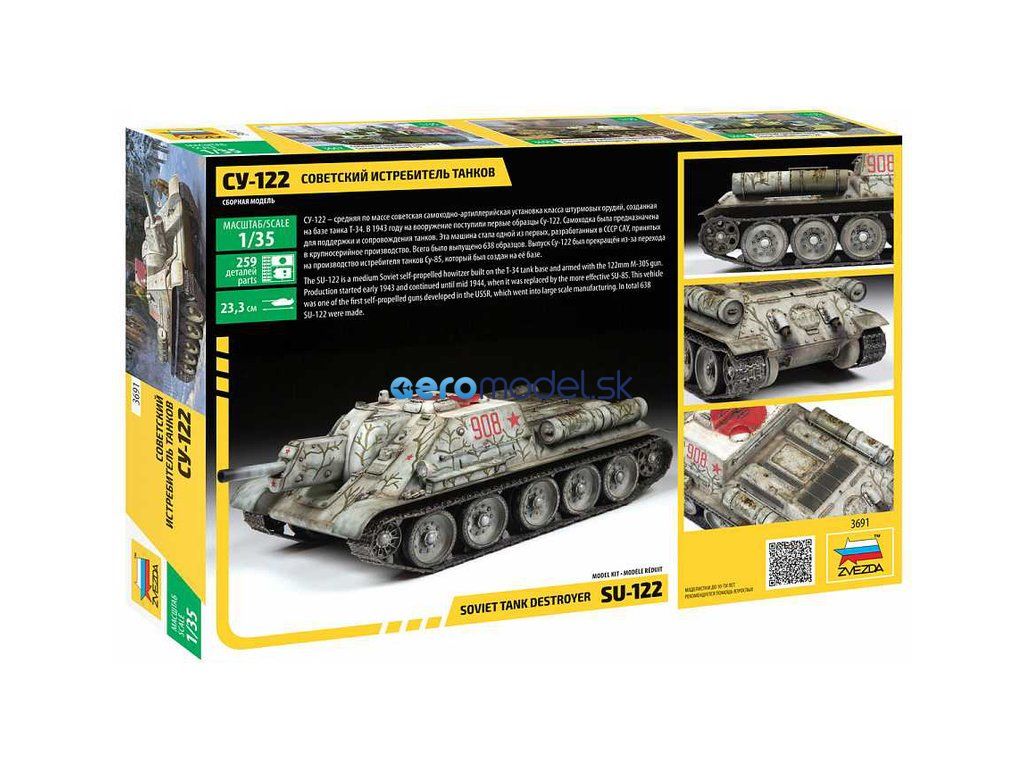 Plastikový model Zvezda 3691 - ruská samohybná delostrelecká jednotka SU-122 v mierke 1:35 na zlepenie. Stavebnica obsahuje 259 dielikov, dĺžka 233 mm.