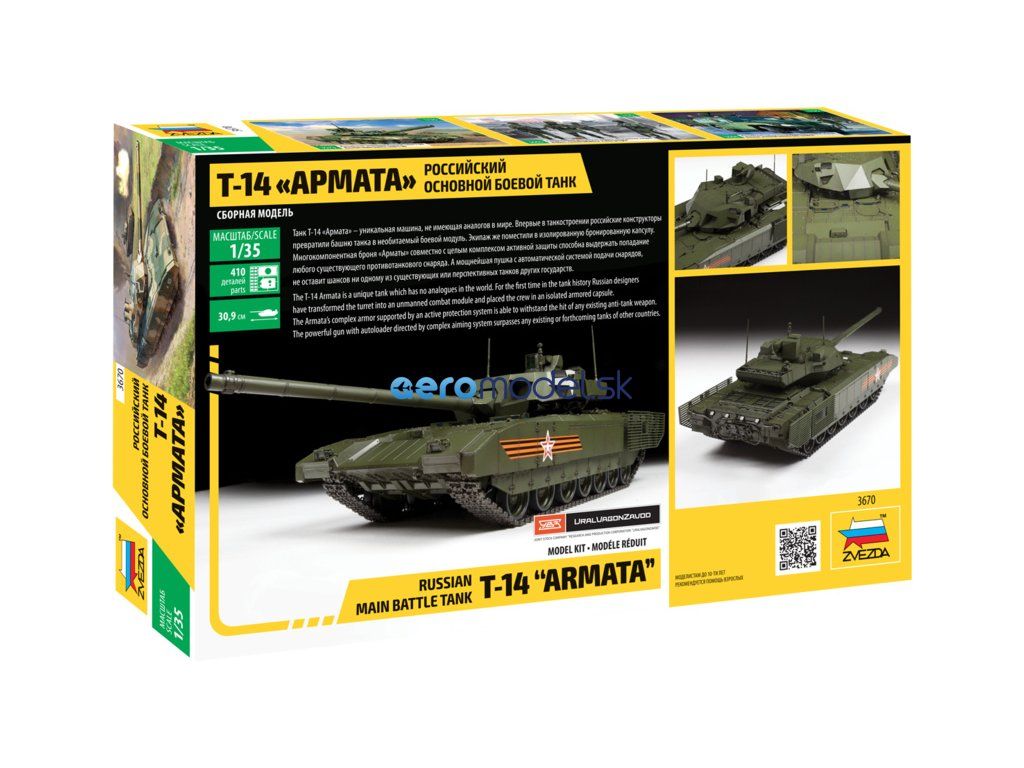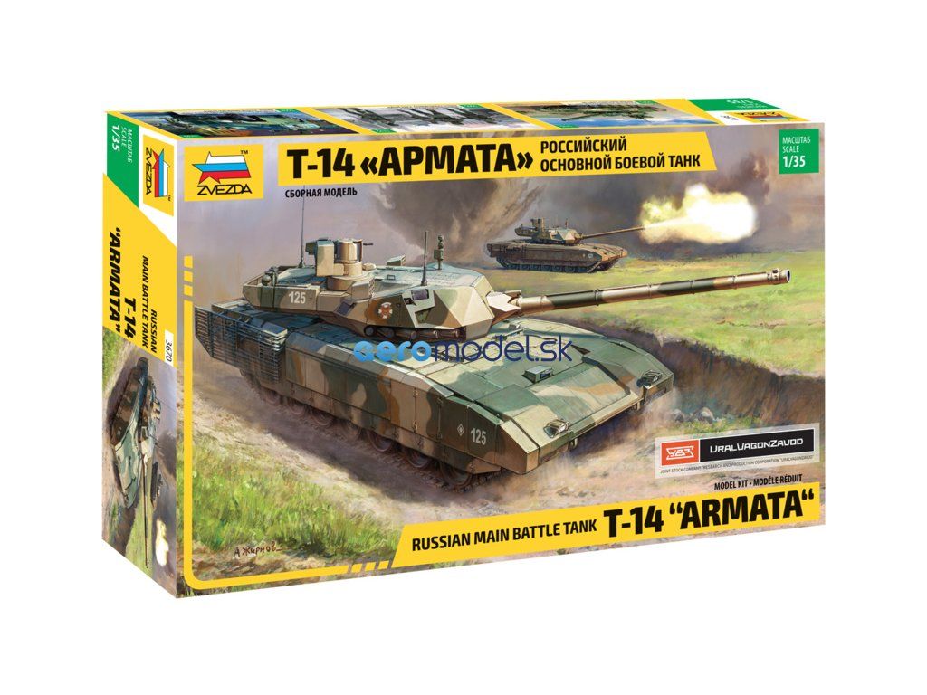Plastikový model Zvezda 3670 - ruský tank T-14 "Armata"" v mierke 1:35 na zlepenie. Stavebnica obsahuje 410 dielikov, dĺžka 300 mm, obtiažnosť 3.