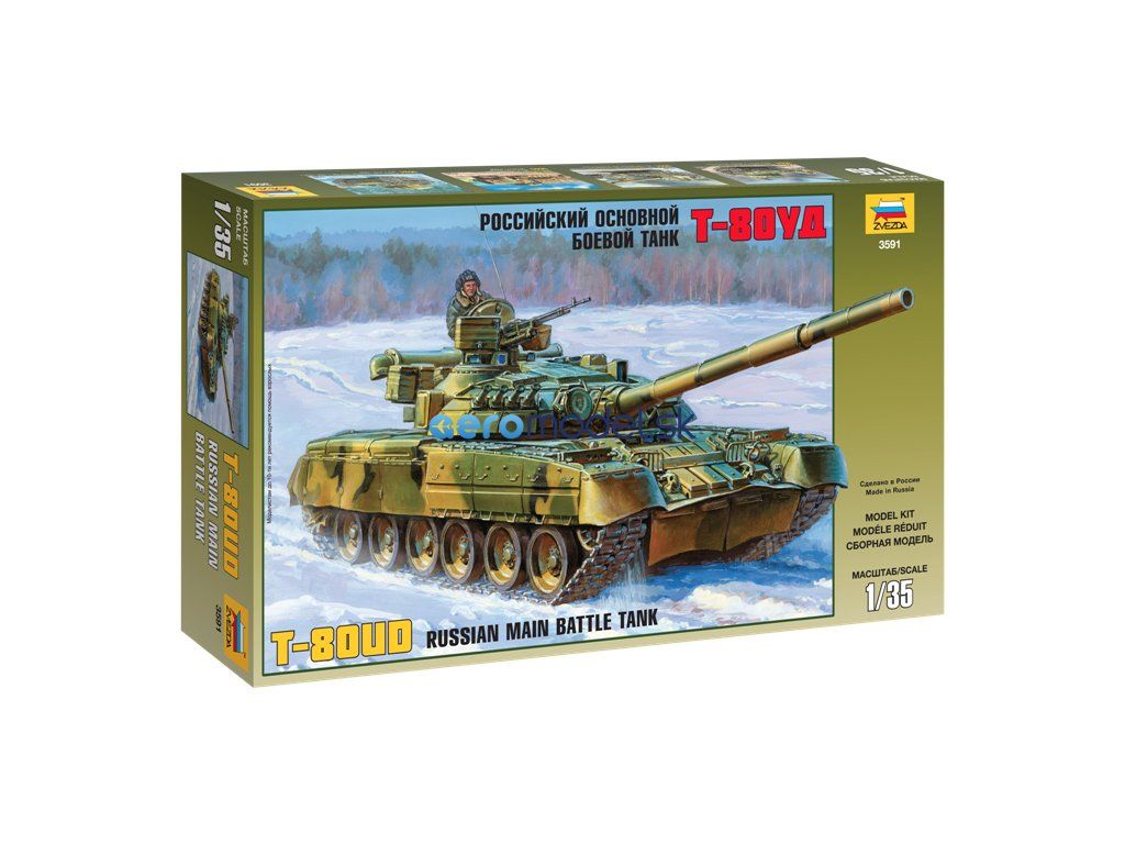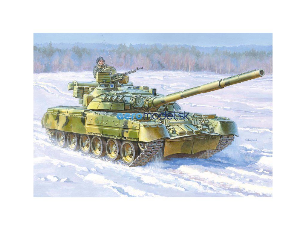 Plastikový model Zvezda 3591 - ruský tank T-80UD v mierke 1:35 na zlepenie. Sada obsahuje 246 dielikov, dĺžka 290 mm.
