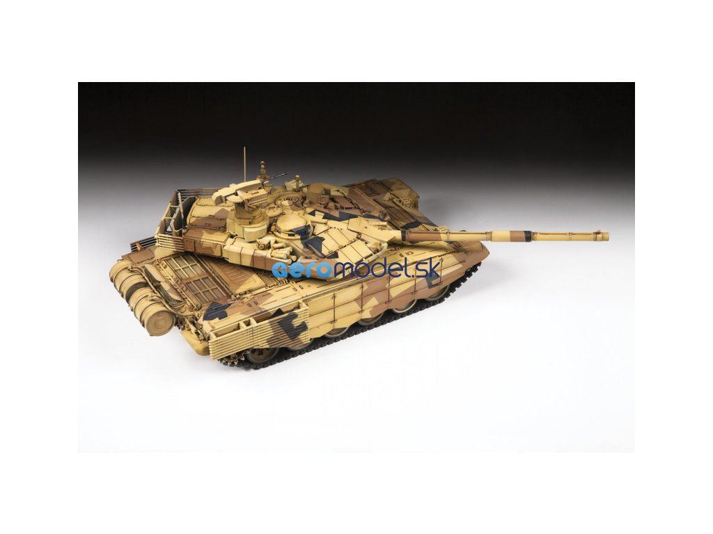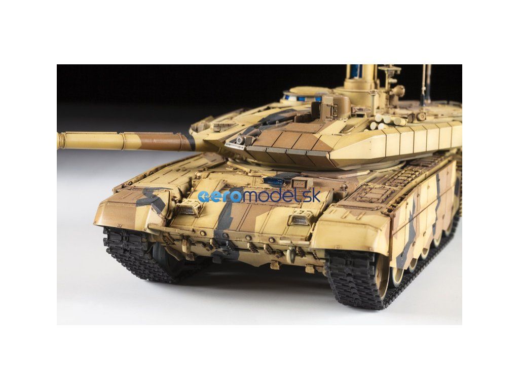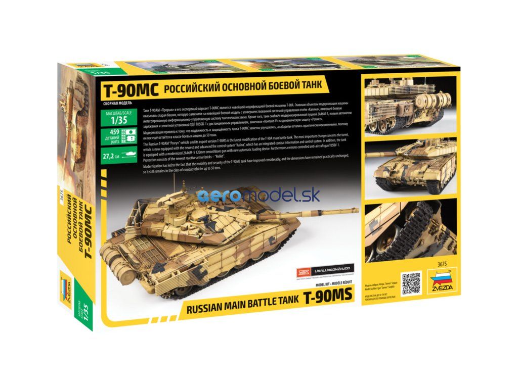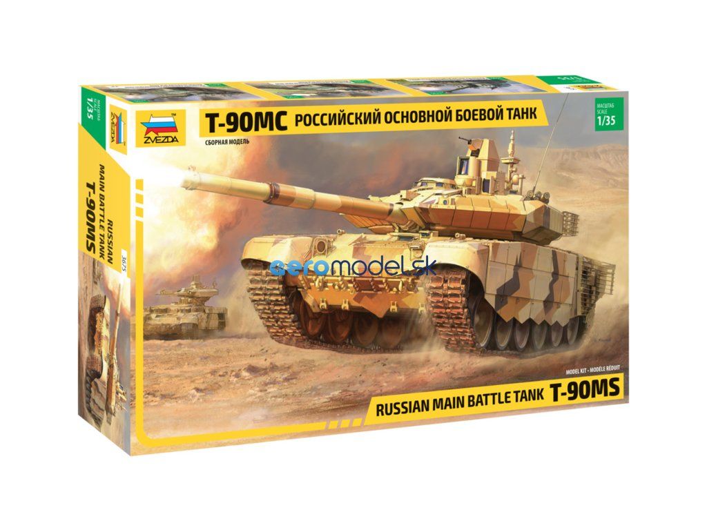 Plastikový model Zvezda 3675 - ruský hlavný bojový tank T-90MS v mierke 1:35 na zlepenie. Stavebnica obsahuje 459 dielikov, dĺžka 270 mm, obtiažnosť 5.