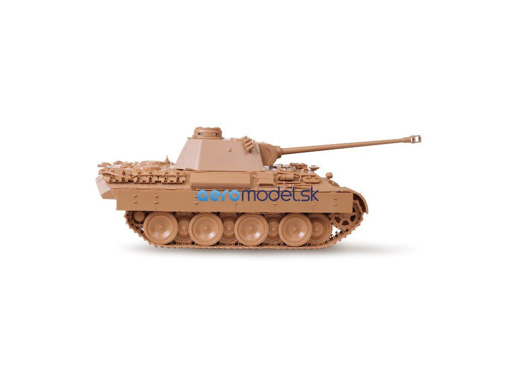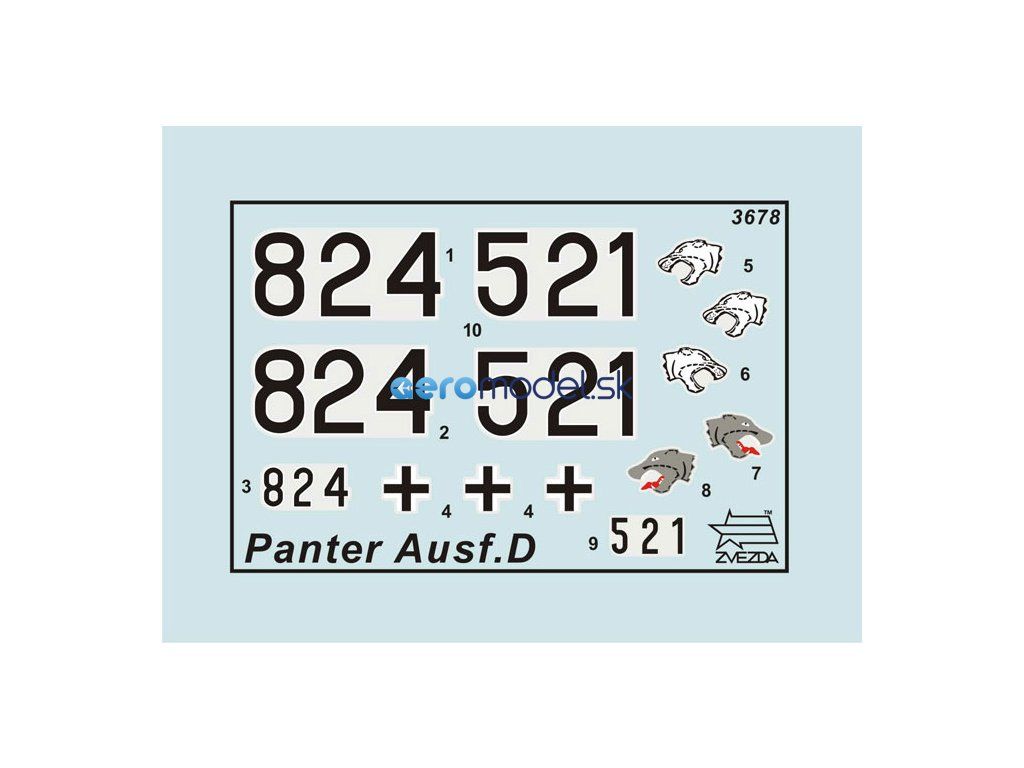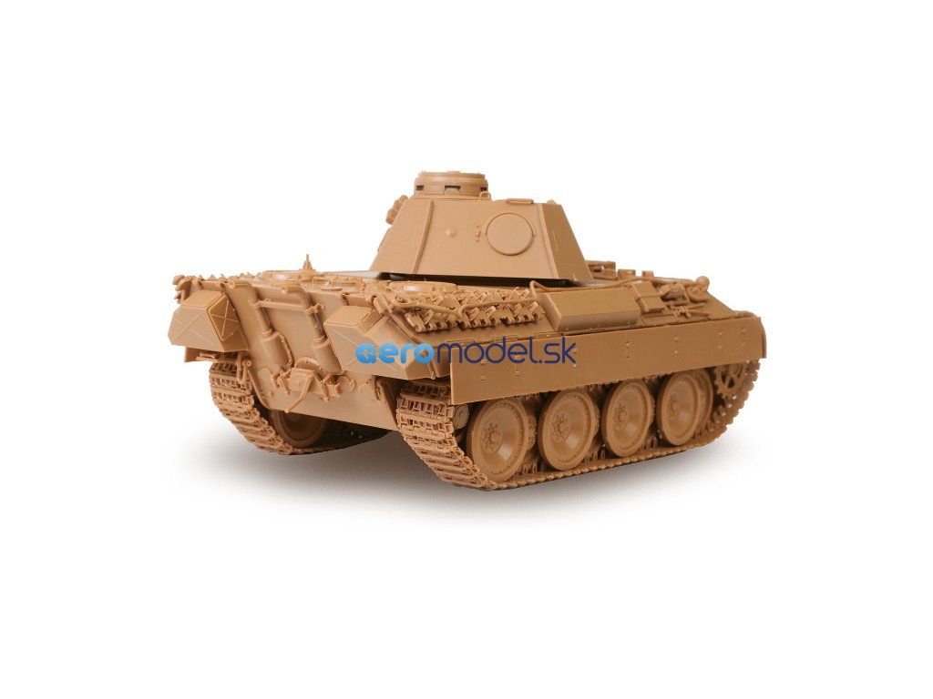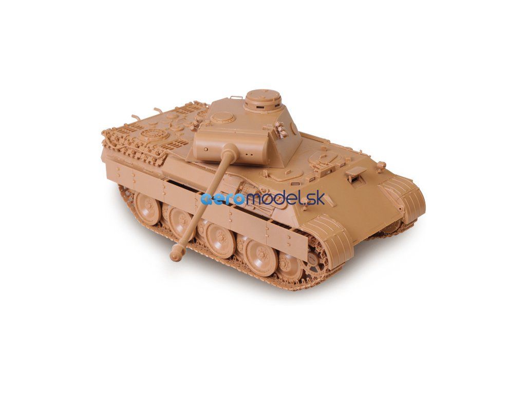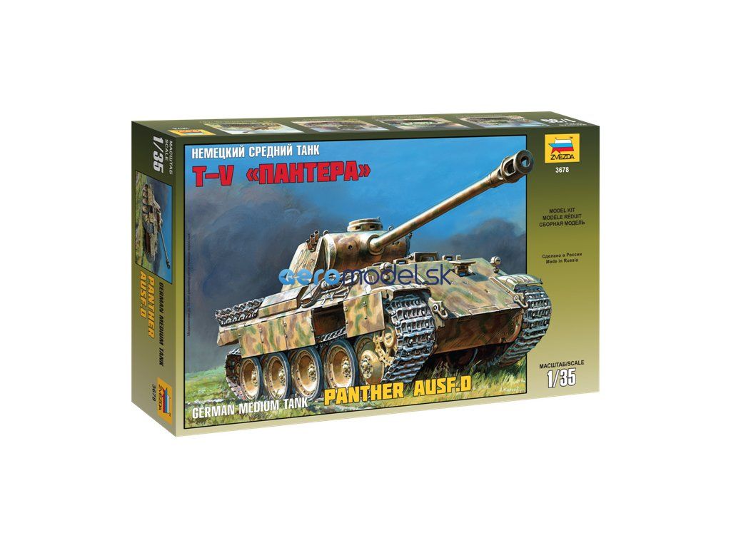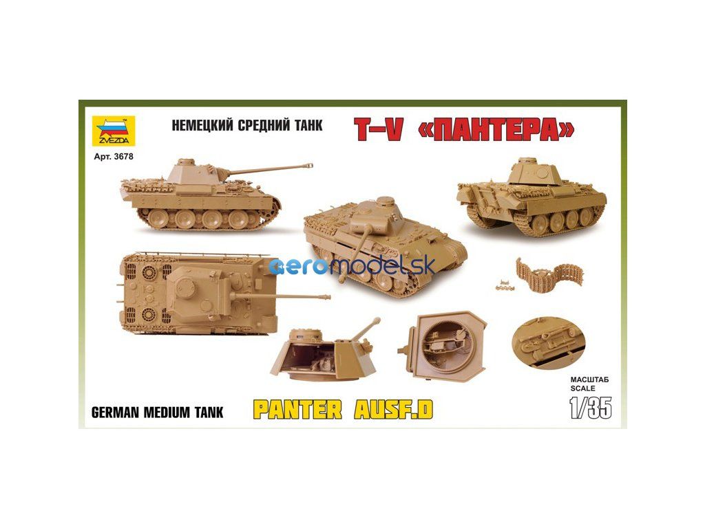 Plastikový model Zvezda 3678 - nemecký stredný tank T-V "Panther" v mierke 1:35 na zlepenie. Stavebnica obsahuje 698 dielikov, dĺžka 247 mm, obtiažnosť 3.