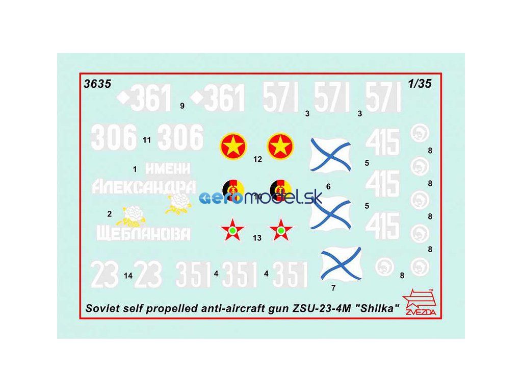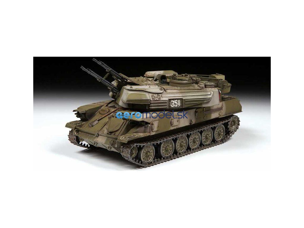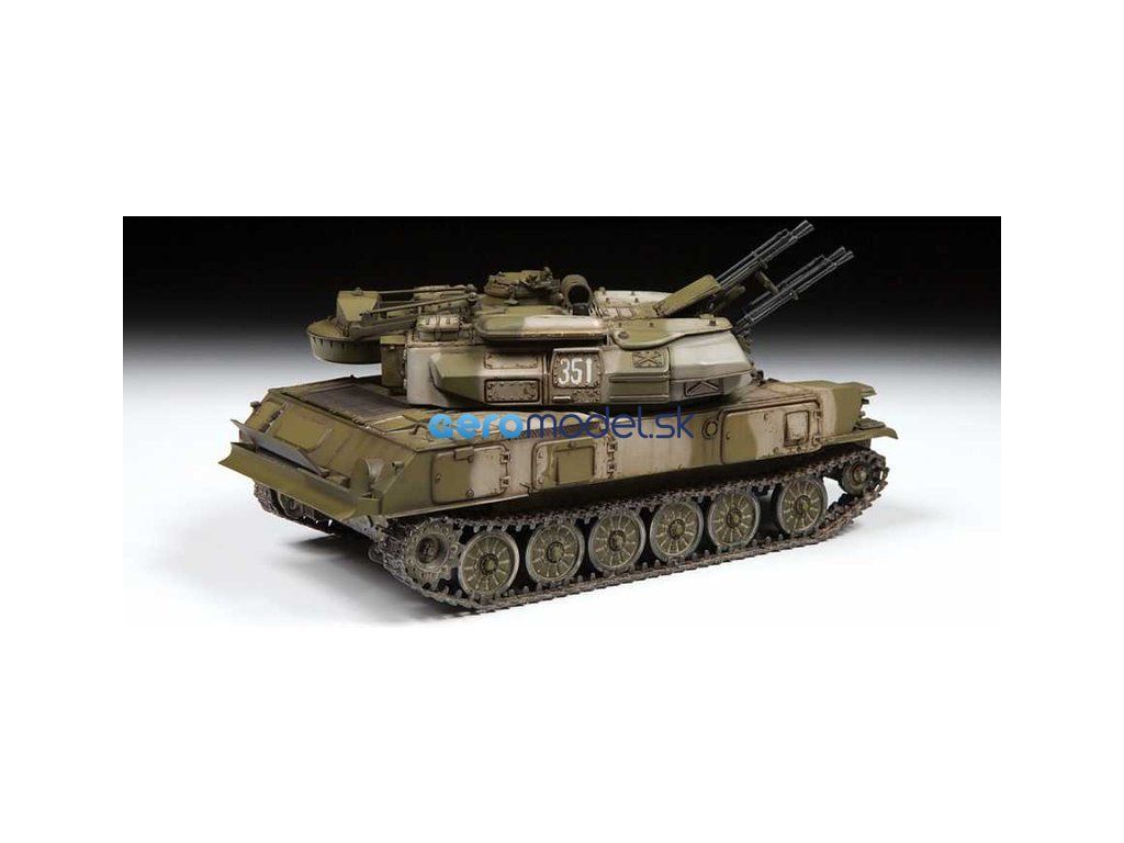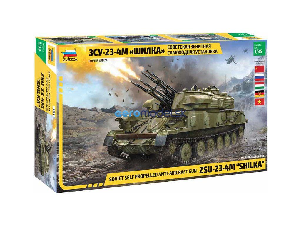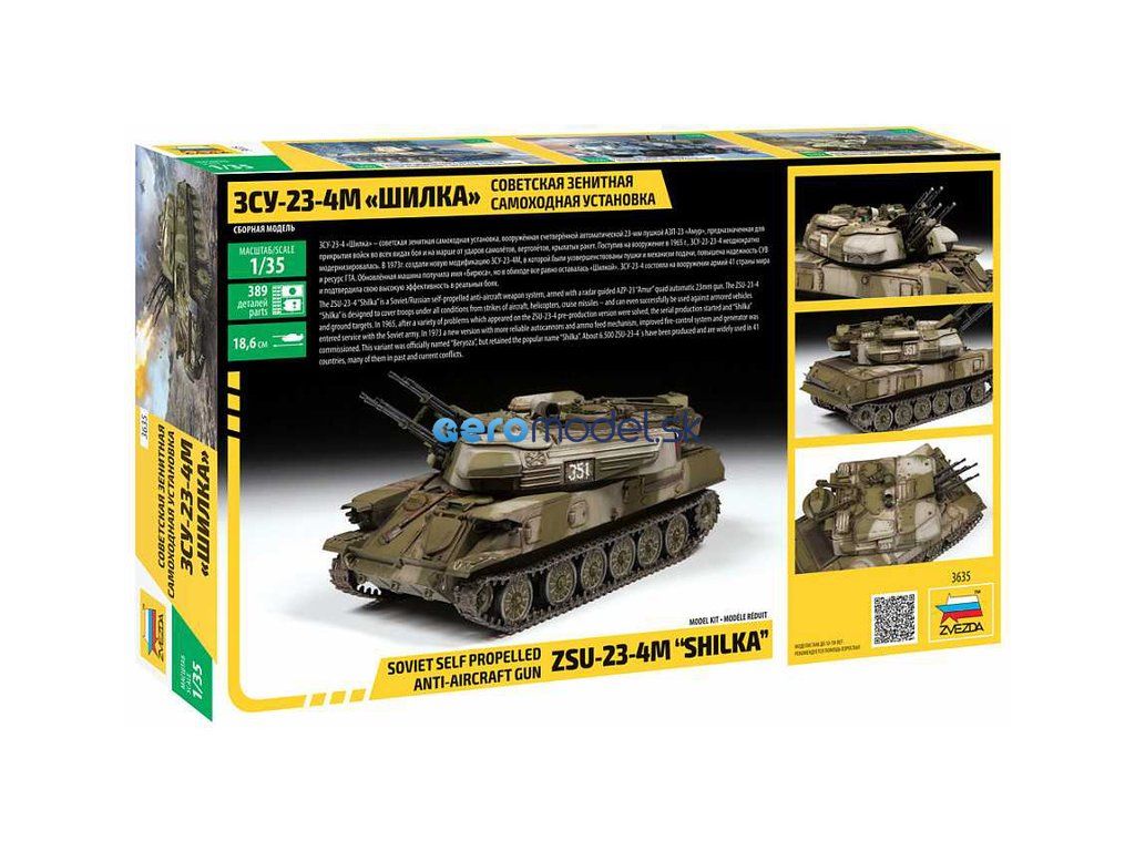 Plastikový model Zvezda 3635 - sovietske protilietadlové samohybné delo ZSU-23-4M "Šilka" v mierke 1:35 na zlepenie. Stavebnica obsahuje 389 dielikov, dĺžka 186 mm.