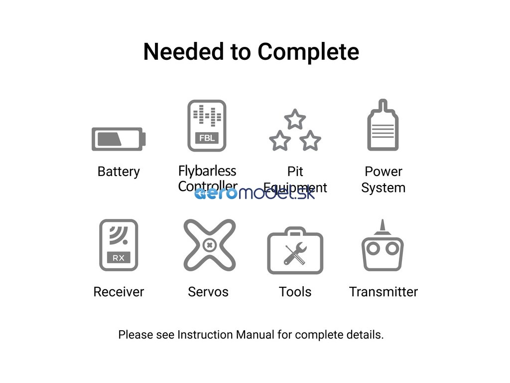 V balení je stavebnice modelu vrtulníku Blade Fusion 550 Quick Build Kit, které obsahuje součásti a sestavy modelu, Spektrum motor střídavý Firma 4320 1150ot/V, uhlíkové listy hlavního rotoru 550mm, sadu listů ocasního rotoru z uhlíku 95mm, návod v češtině, manuál EN, DE, FR, IT.