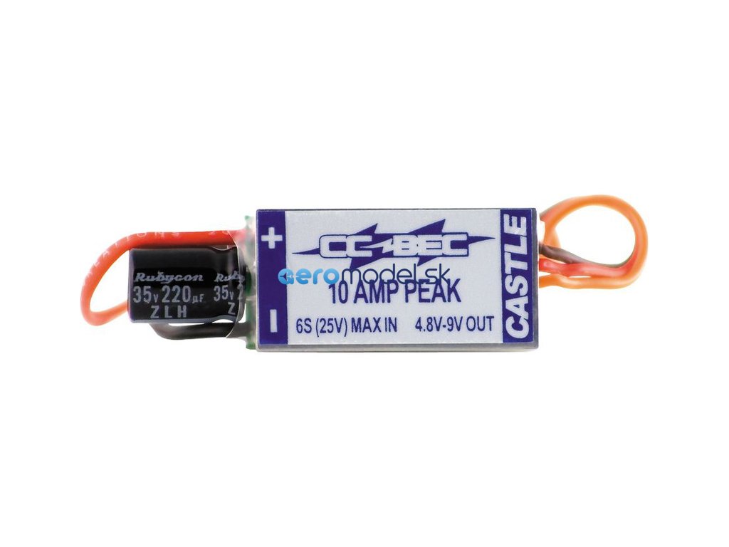 Programovatelný spínaný stabilizovaný zdroj BEC pro přijímač a serva. To je nutné všude tam, kde se předpokládá vyšší odběr serv nebo při použití více než 3 čl. LiPol akumulátoru. Regulátor se programuje programátorem Castle programátor USB Link V3. Výstupní napětí je nastavitelné v rozsahu 4.8 až 9.0 V s krokem 0.1 V.